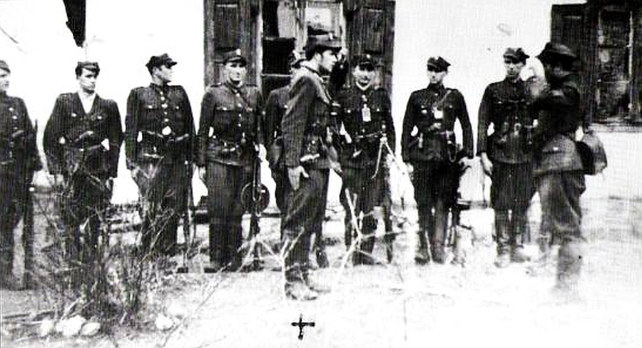 Otoczony przez grupę operacyjną UB w miejscowości Czerwone popełnił samobójstwo chor. Hieronim Rogiński, ps. „Róg” (w środku). Był uczestnikiem wojny obronnej z 1939 roku, później żołnierzem ZWZ-AK, a następnie Narodowych Sił Zbrojnych.