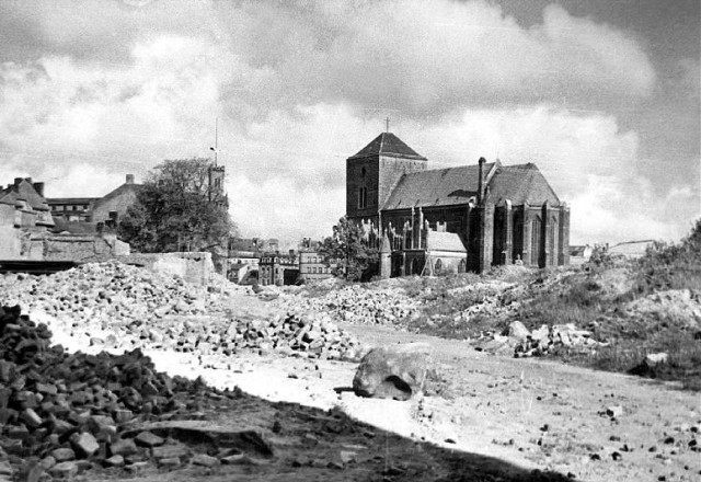 Ruiny słupskiej starówki 1945 rok, w tle widoczny kościół Mariacki