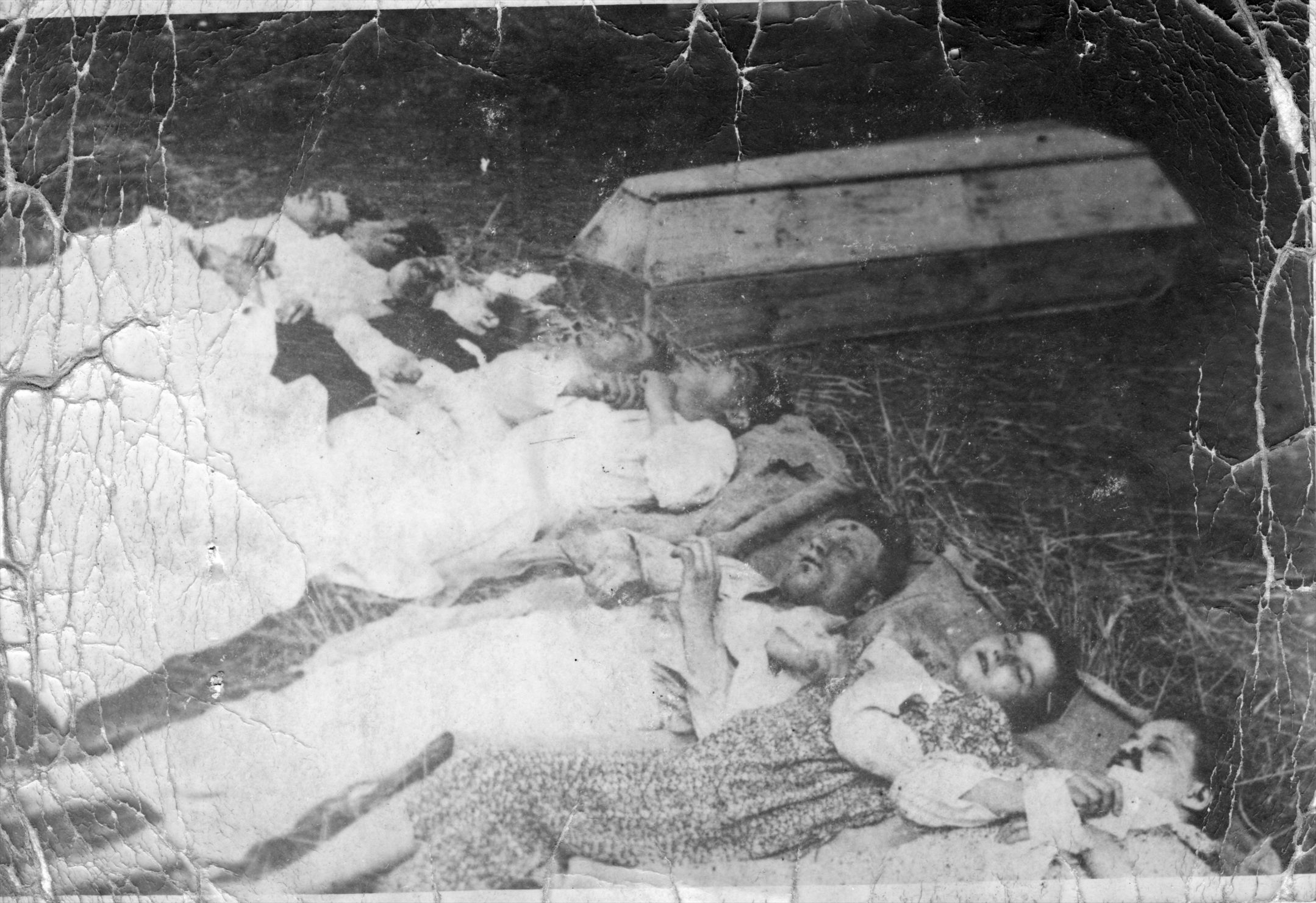Zwłoki członków rodziny Rudnickich zamordowanych we wsi Chobułtów podczas Rzezi Wołyńskiej